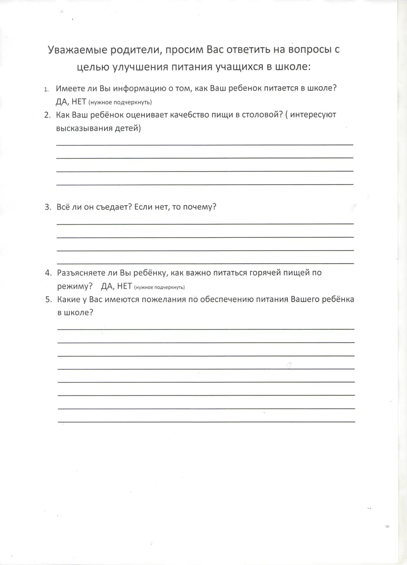 Анкета о качестве питания в школе