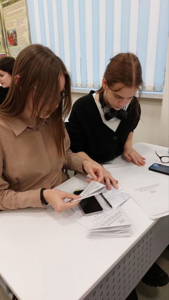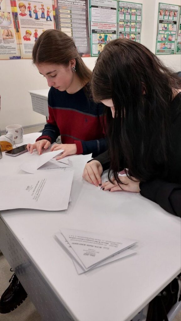 * почтили память героя, возложив цветы к мемориальной доске.Особая благодарность ученикам 11в класса — без их помощи нам не удалось бы сложить такое количество фронтовых треугольников!